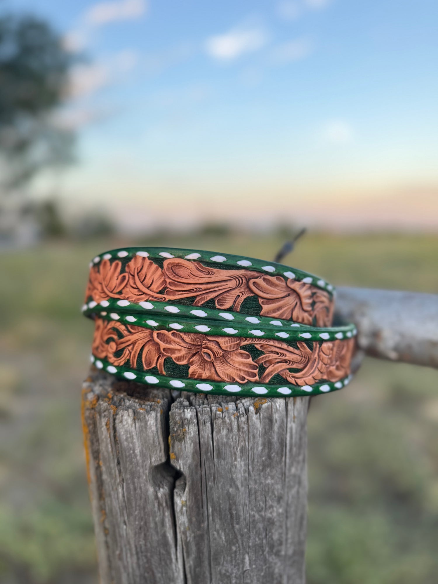 Tooled Floral Belt/Buck Stitched/Green